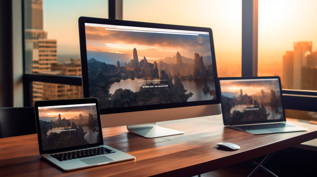 Modern, responsive web page design shown on laptop, tablet and phone devices on an office desk. Generative AI illustrator